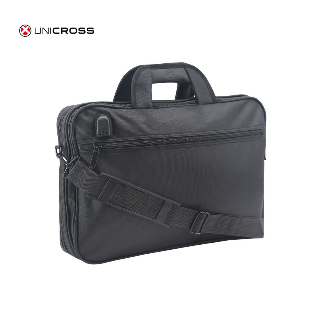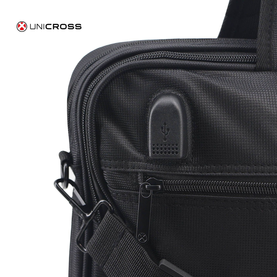 Portafolio porta notebook. Contiene puerto USB, doble compartimento, correa de hombro extensible y desmontable.